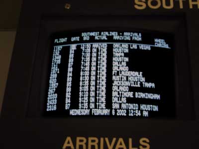 The plane was too crowded to write, and I just turned on my iPod and napped. I reloaded my iPod with 1149 songs before I left, so there's plenty to listen to. I even included 28 tracks of audio Spanish lessons, which is a little weird when it comes up on random shuffle. I just go with it though; after all, listening to good music seems like a great reward for making it through a 6 minute lesson. (Tengo que hacerlo porque necessito estudiar.) I am Kevin's sleepy brain, arriving on the last flight of the night, and making my way to the hotel. More to come... Monday, Feb 04, 2002