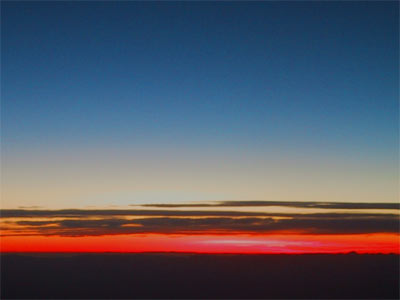 ... Okay, a spicy tomato juice and some air turbulence later (thankfully for my powerbook's sake, not in tandem), mountains are giving way to desert, the sand licking the foothills like a sea of its own. We've been airborne for a half-hour out of San Jose, and I have another half-hour or so before landing in Las Vegas. ... Vegas: City of Lights. Whenever possible, fly in or out of Las Vegas at night. On nights like tonight, when the sky is clear, I've been told pilots can see the Luxor's beam of light from 200 miles away. We'll see if the right side of the plane is indeed the 'right side' for the show, landing in Las Vegas. I know it's right on the way out. Sadly (well, from one perspective) my stay in Lost Wages will only last about 53 minutes, barely enough time to lose a milliwage at the quickie pizza shop in the Southwest terminal before hopping on another plane (which, unlike this one, will be completely full. I wonder if the person next to me will try to read my screen? Hmm.. just in case...) ...