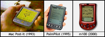 This is too funny to pass up. Take a look at the home page for the Palm m100, and then look at the 1993 Saturday Night Live parody commercial for the Macintosh Post-It. Once again, parodies of early Apple products end up being accurate predictors of the future...