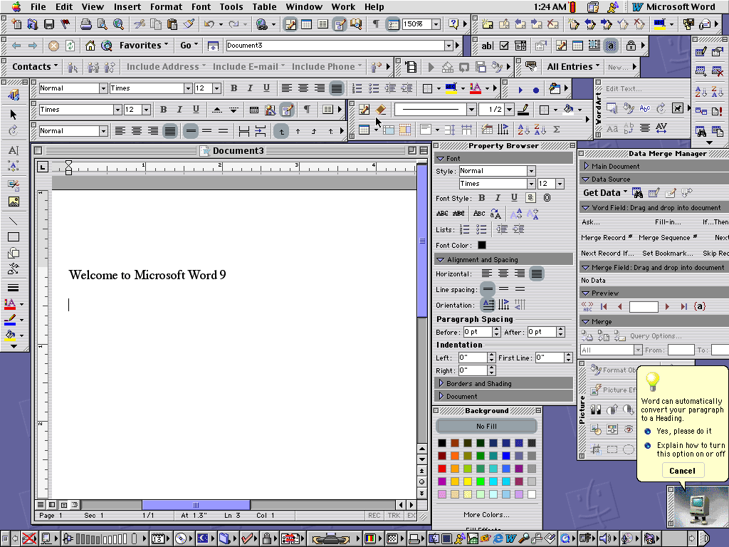 If Moore's law says processor speed doubles every 18 months (actually, as originally stated, it predicted that the density of transistors on a microprocessor would double every 12 months, but it's been twisted mnay times in the last 25 years to fit history), then why don't our machines feel faster? Well, Moore was a co-founder of Intel and, as we all know, the reason Intel has to keep making faster chips is to make their machines not feel so slow. Mind you, it's not Intel's fault that they feel slow, but because Microsoft has to double the complexity of its software every 18 months to even out the equations. You don't believe me? Take a look at a screen shot of Microsoft Word 2001. PS: If anyone has a screen shot of MS-Word 1 or 3, please forward it to me. I'd love to put it up for comparison. Come to think of it, I might be able to find a copy and run it on the vMac Mac Plus emulator. Friday, Jul 14, 2000